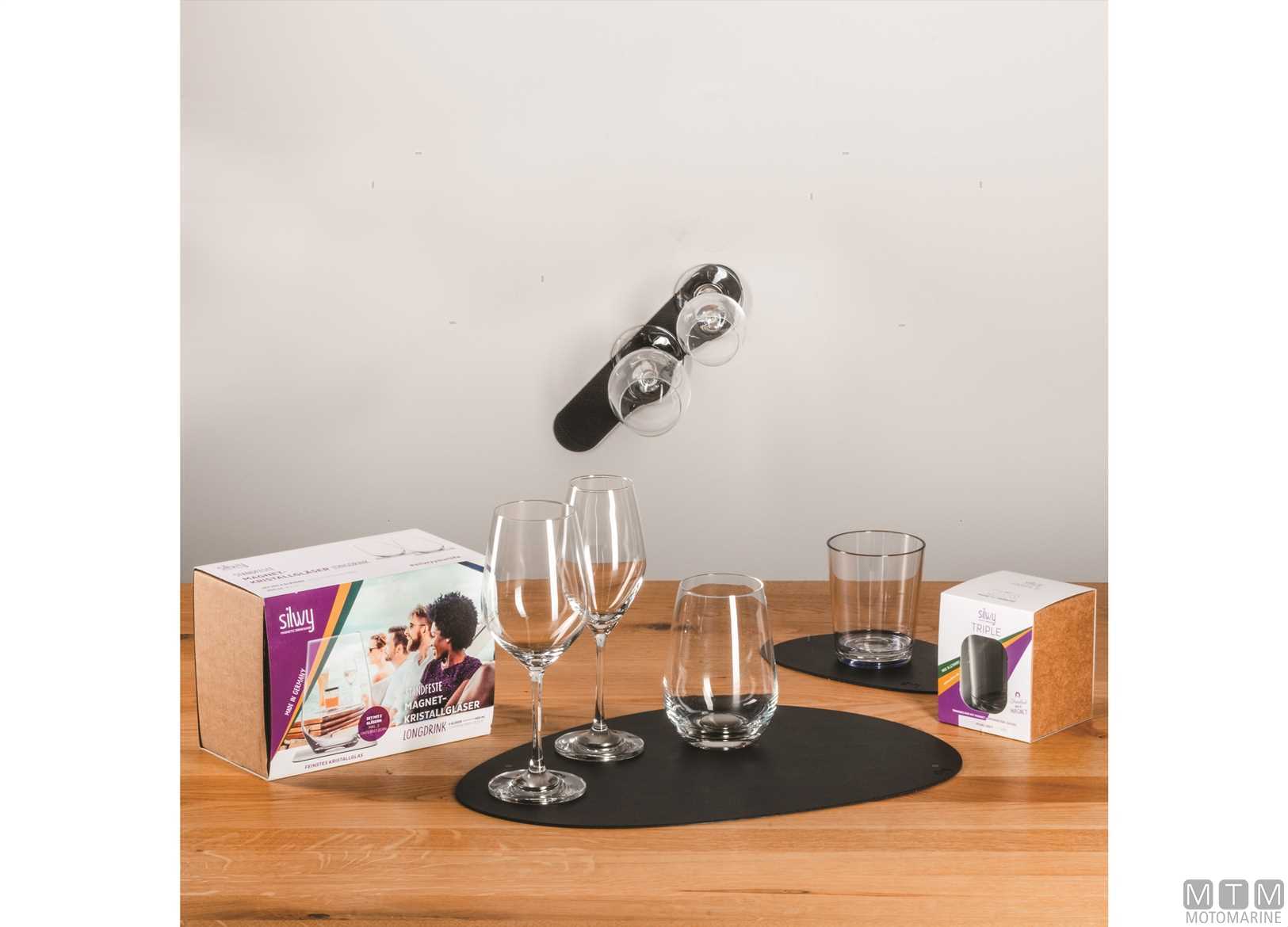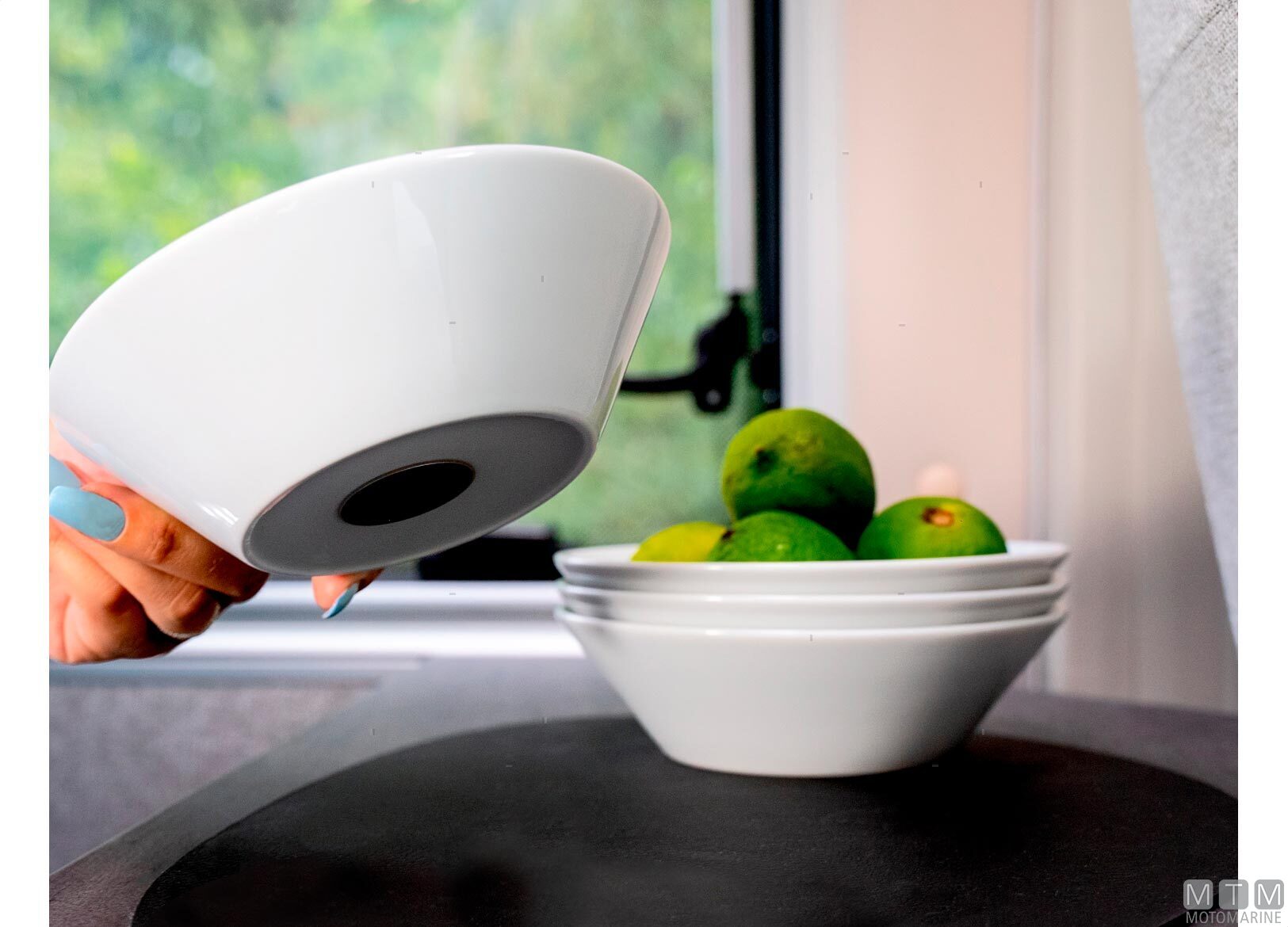 Tappetino nano-metallico con rivestimento in ecopelle e speciale superficie antiscivolo che mantiene le stoviglie stabili anche durante i tragitti accidentati o in presenza di onde. Grazie allo strato di gel può essere rimosso senza lasciare residui sulla superficie.