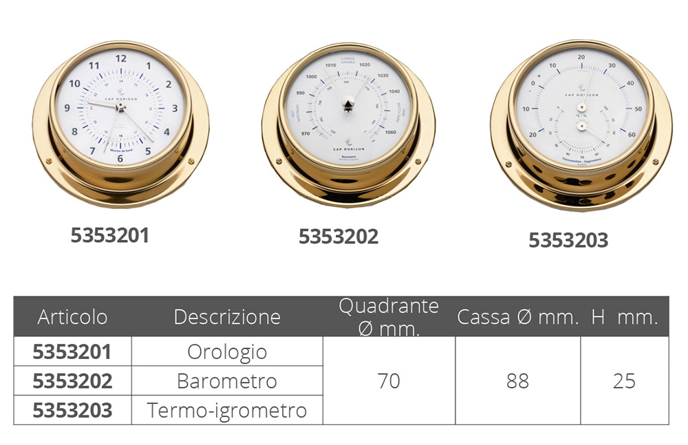 Strumenti di bordo in ottone lucido, quadrante Ø mm. 70, Ø cassa mm. 88 x 25 h