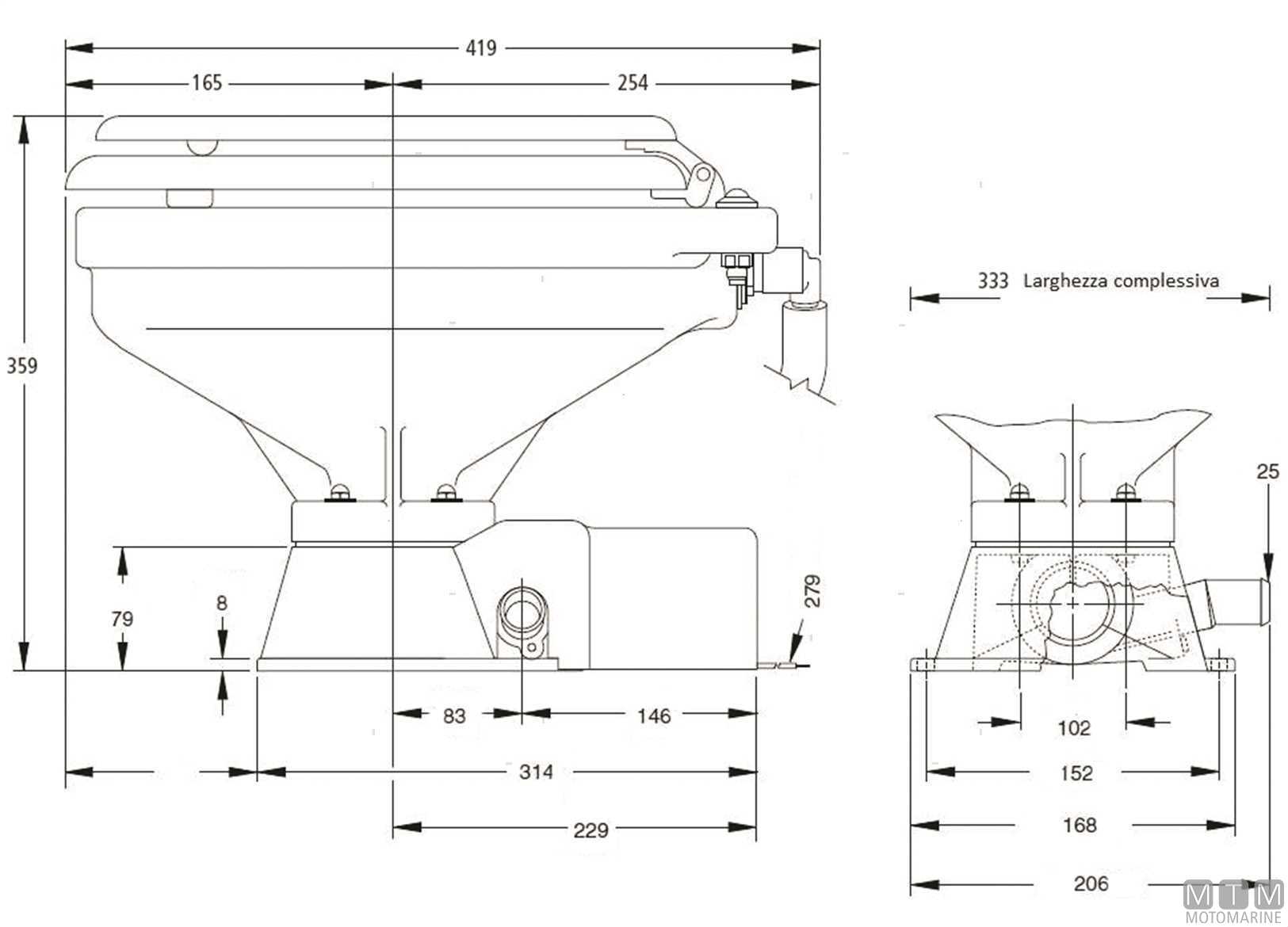 Toilet elettrica Jabsco Quiet E2 serie 38245 con tazza in Porcellana, flusso silenzioso e maceratore ad alta capacità. Completa di pannello comando e pompa carico acqua autoadescante con filtro e raccordo da 19 mm, funziona anche con acqua salata. La base può essere montata in varie direzioni a seconda dello spazio disponibile con il raccordo scarico da 25 mm posizionabile a destra oppure a sinistra del maceratore.