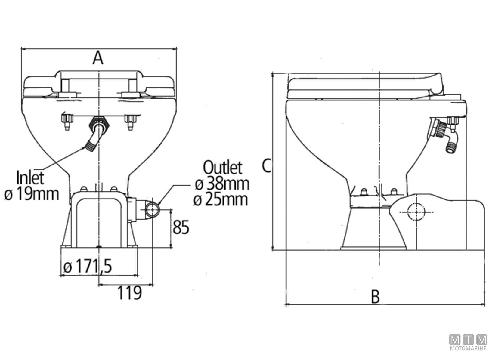 Toilet Johnson AquaT Standard con pompa a doppia azione combinata per lo smaltimento e per il riempimento dell'acqua. Funziona sia con acqua dolce che salata e si può montare sopra o sotto la linea di galleggiamento. Disponibile in tre modelli: ↵↵• Super Compact – super compatta e leggera con seduta rotonda ↵• Compact – compatta per spazi limitati con seduta rotonda ↵• Comfort – grande e comoda con seduta ovale ↵↵Realizzata in porcellana vetrosa bianca di eccezionale qualità per una perfetta igiene. ↵Pannello di controllo incluso con azione di risciacquo a vortice per un lavaggio efficiente. ↵Punti di montaggio facilmente accessibili per un'installazione veloce senza attrezzi speciali. ↵Entrata Ø 20 mm / uscita Ø 25 mm.