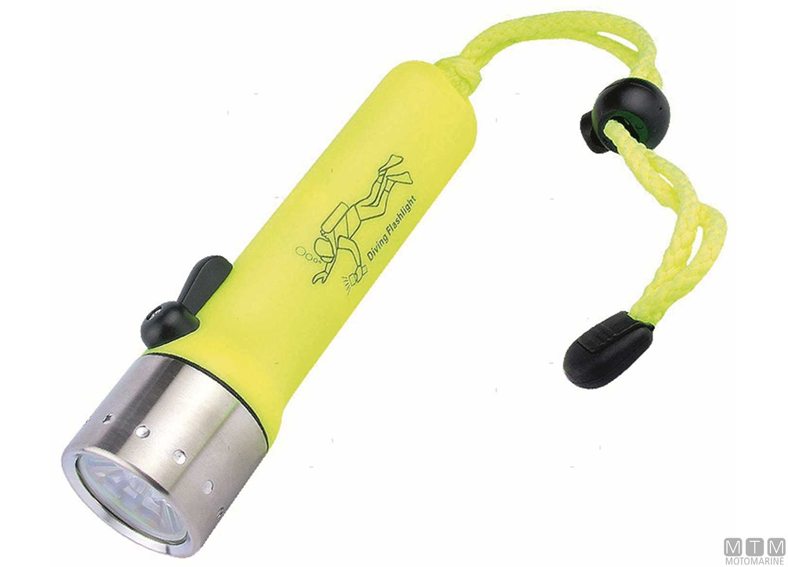 Torcia LED impermeabile fino a 20 metri di profondità per uso subacqueo e multiuso. Luminosità 180 Lumen per 12 ore di autonomia.↵Funziona con 4 batterie tipo AA (non incluse).