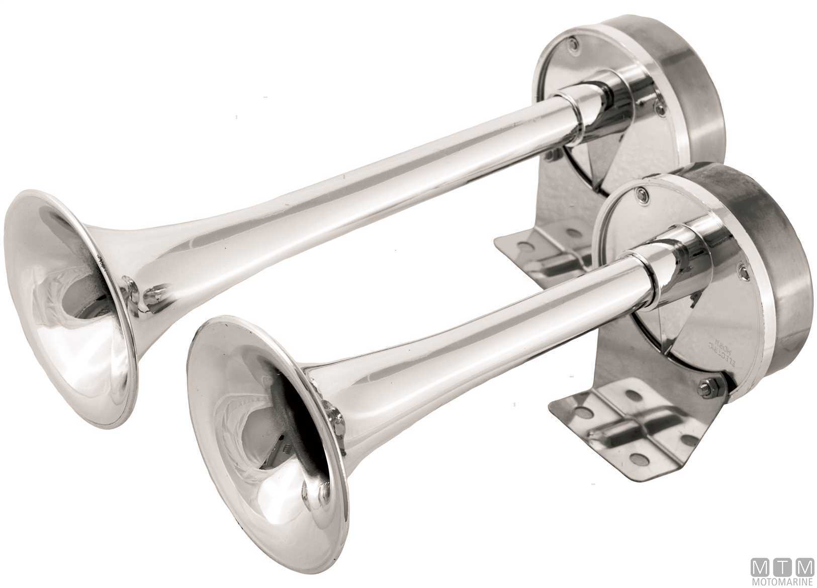 Tromba elettrica doppia con cornetto. ↵Corpo in Acciaio Inox. Cornetti in ABS Cromato.