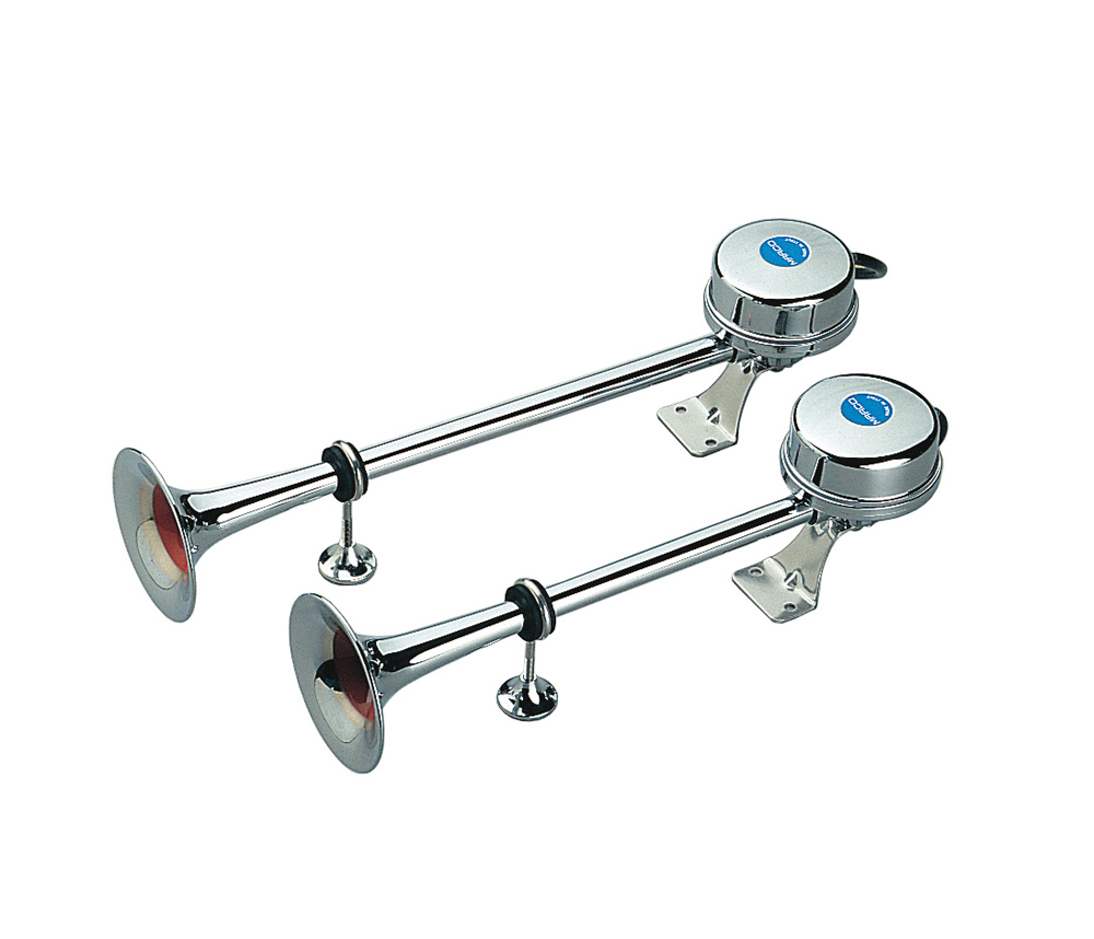 Coppia tromba elettromagnetica con cornetti in acciaio inox,suono bitonale potente e chiaro, udibilità in mare mt. 1.800,livello sonoro 121 dB, 320/370 Hz. Lungh. mm. 400 e 470