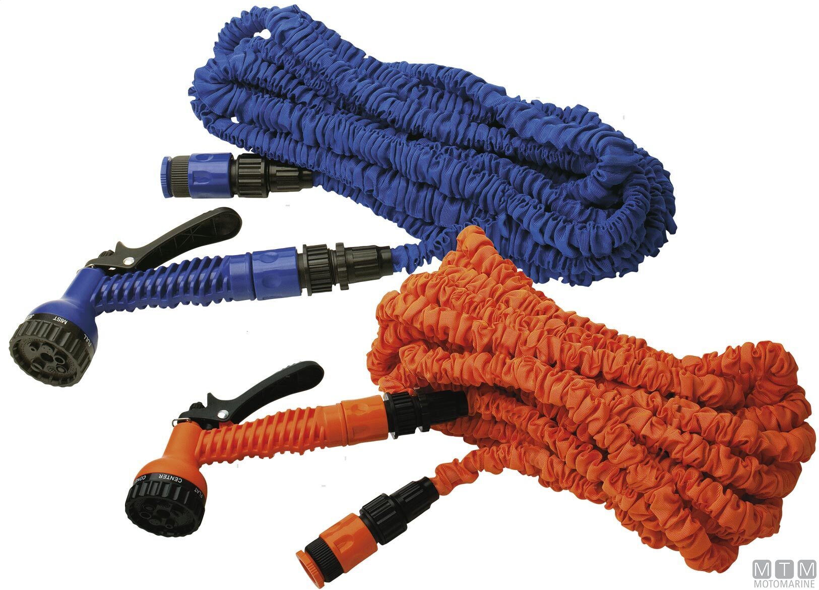 Manichetta estensibile completa di attacchi rapidi e pistola con 7 regolazioni del getto. ↵• Comoda e pratica si allunga durante l'uso e si accorcia da sola una volta chiusa l'acqua ↵• Flessibile non si attorciglia e non si strozza mantenendo la pressione costante ↵• Compatta e leggera è facile da stivare in spazi ristretti ↵• Ricoperta da una robusta guaina di protezione ↵Avvertenze:↵1) Non lasciare mai la manichetta in pressione senza aprire il getto della pistola ↵2) Durante le pause usare la leva di blocco per far uscire un getto di sfogo