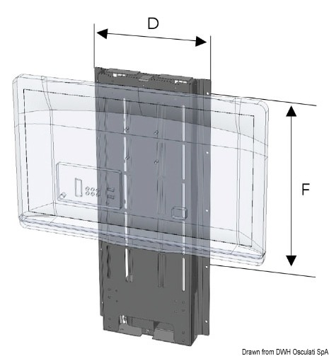 Sollevatori elettrici verticali per TV. Compatibili con i sistemi di fissaggio VESA 75/100 /200. Elementi verniciati o anodizzati in colore nero. Velocità indicativa da 22 a 25 mm/s in base al peso della TV. Richiede un interruttore 6 poli per invertire la polarità. Tipo 14.192.03 o 48.749.01