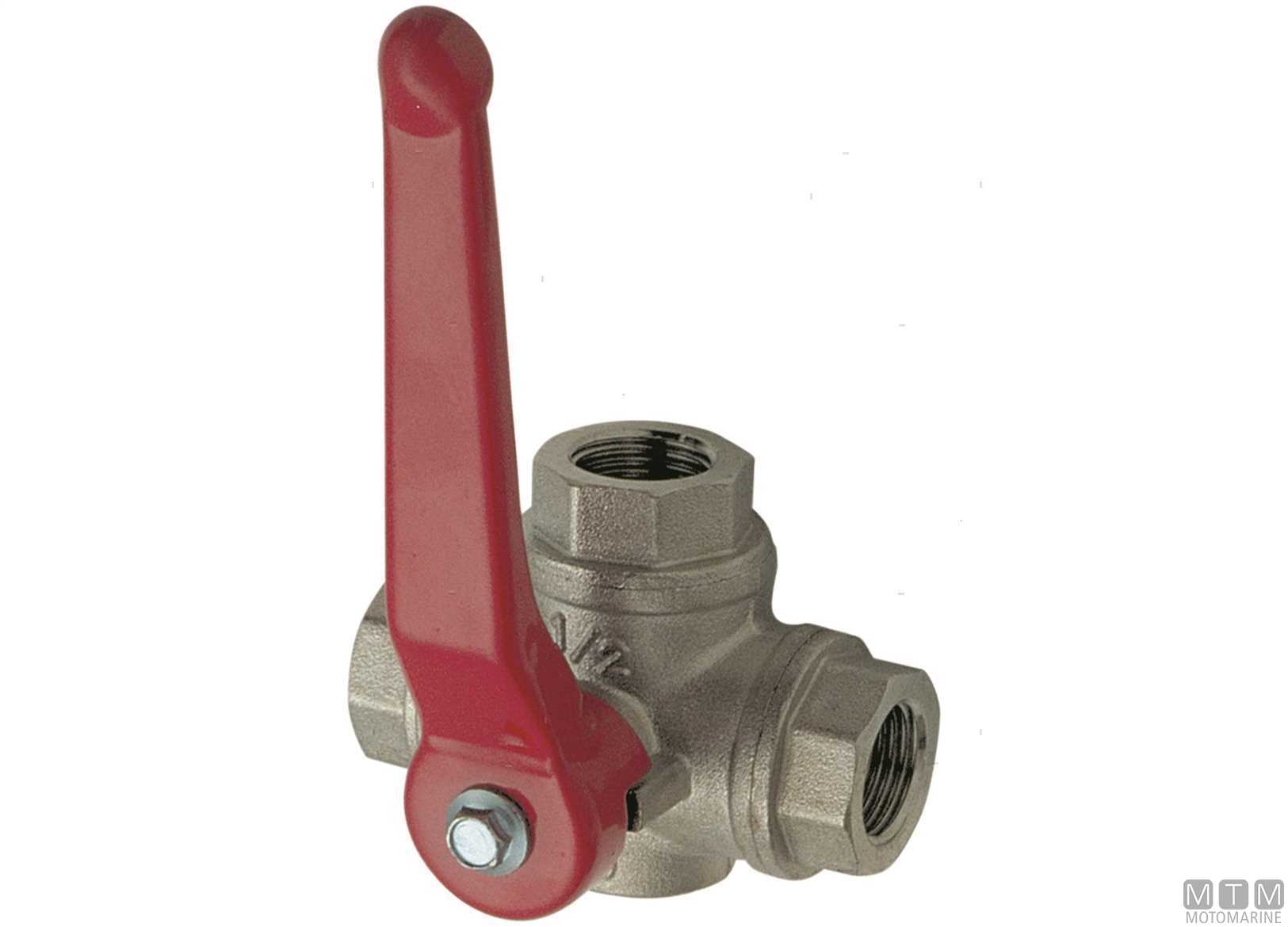 Valvola a sfera a 3 vie in Ottone. Maniglia a 3 posizioni con flusso a T.