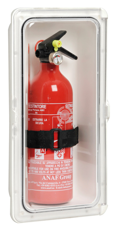 In polipropilene bianco con portello in policarbonato resistente UV trasparente e chiusura a scatto per estintori ANAF da 1 kg. Tenuta stagna, ottime finiture, colore bianco. Fornito con appositi supporti e nastro autobloccante apribile per un ottimo fissaggio dell’estintore.
