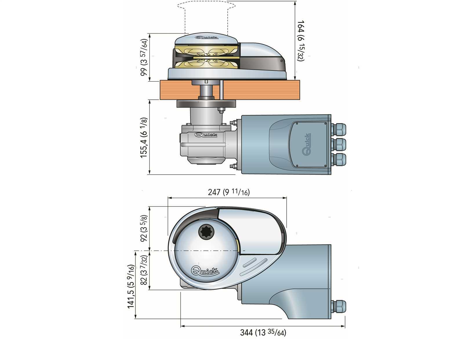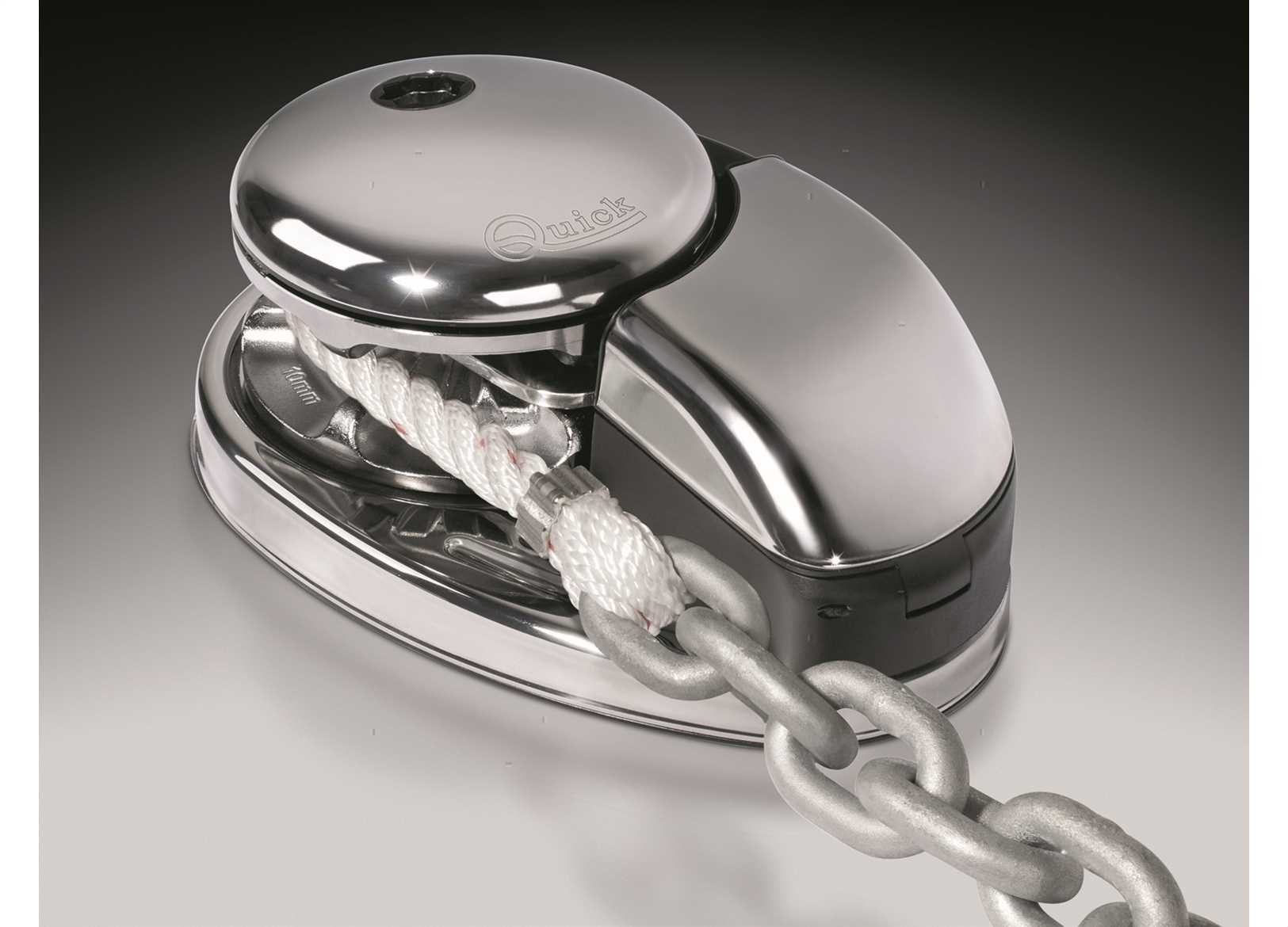 Verricello salpa ancora cima/catena Quick con organi di trazione in Bronzo e Acciaio Inox. Con sistema manuale di caduta libera della catena e dispositivo tendicima. Testa e base in Acciaio Inox. Motore stagno IP67. Completo di control box e maniglia. I verricelli della serie economica Custom Line non hanno il sensore contametri.