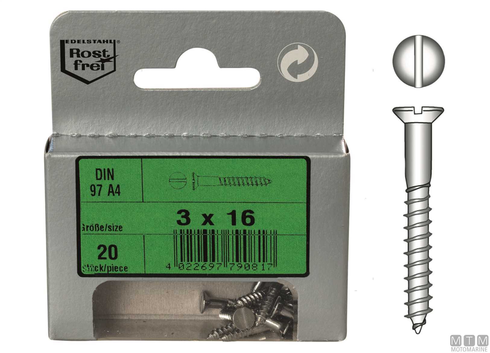 Viti legno testa svasata piana DIN 97 in Acciaio Inox A4.↵In comodi ed eleganti blister.