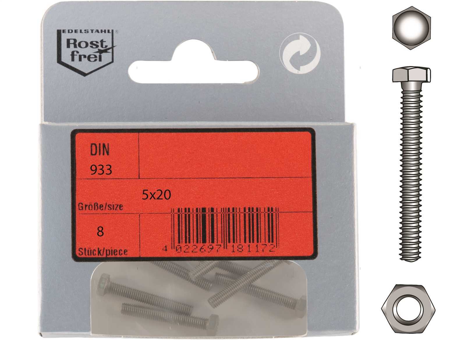 Viti testa esagonale DIN 933 in Acciaio Inox A4.↵ Confezione in Blister completa di dadi.