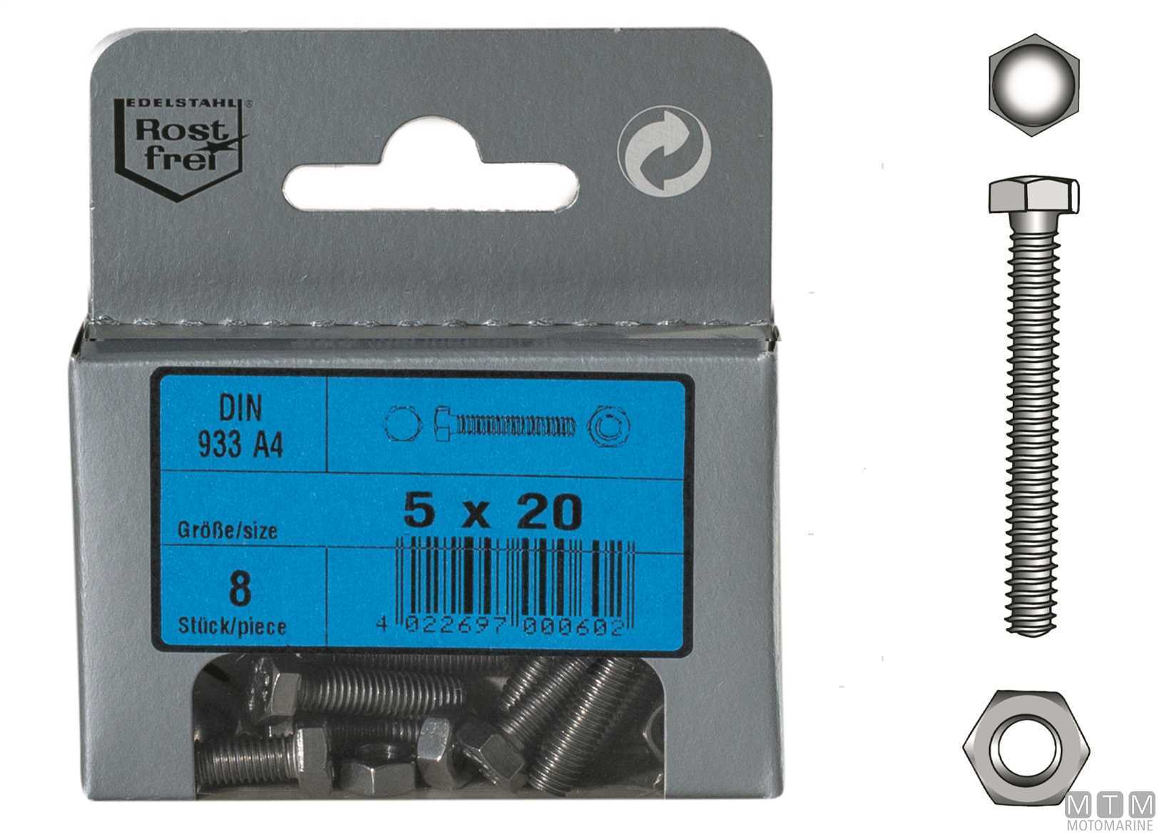 Viti testa esagonale DIN 933 in Acciaio Inox A4.↵ Confezione in Blister completa di dadi.
