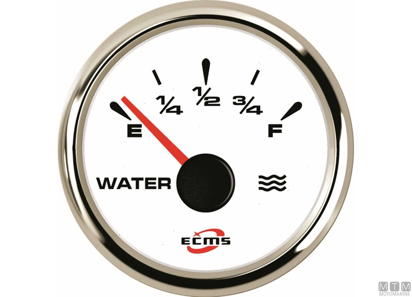 Strumentazione Ecms White Chrome 9-32V completa di cavetti con connettore Molex, cornice in Acciaio Inox 316 con finitura cromata e frontalino impermeabile IP67 con lente bombata anti-appannamento. Quadrante retroilluminato con luce LED personalizzabile in vari colori. ↵Gli indicatori di livello si possono impostare su qualsiasi valore di impedenza tramite il tasto posteriore di configurazione. Sono pre-impostati sul valore standard 0-190 Ohm. ↵Gli indicatori pressione olio da 5 e 10 bar sono compatibili con sensori standard (10-180 Ohm), mentre il 30 bar è compatibile solo con sensori elettronici (0,5-4,5V). ↵Gli amperometri sono completi di sensore (shunt) per misurare la corrente.